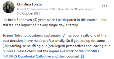 "Intro to Decolonial Sustainability was an unsettling but rewarding course that highlights the need to centre Global South voices and nature and to do the continuous work for actual sustainability, instead of the watered down version that we have become accustomed to. A must for all those who are in corporate sustainability, philanthropy, international development and social impact."