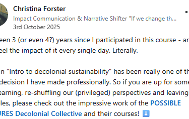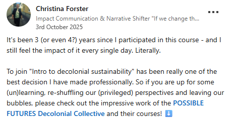 "The Introduction to Decolonial Sustainability Pilot course has opened doors to a level of conversation, learning, and interrogation that is not often seen in the sustainability world. The team shared uncomcomfortable realities and helped the cohort navigate these through careful and well-held sessions that challenged us in our use of language, levels of accountability , and types of action. Though I have been aware and working in elements of decolonial sustainability, the course helped me define and deepen purpose and "sift through the detritus" of what persists in the worlds of "sustainability" and "regenerative thinking". I'm looking forward to the Possible Futures Crew's next steps in unwinding Sustainability Inc.!"