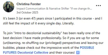 "The Introduction to Decolonial Sustainability Pilot course has opened doors to a level of conversation, learning, and interrogation that is not often seen in the sustainability world. The team shared uncomfortable realities and helped the cohort navigate these through careful and well-held sessions that challenged us in our use of language, levels of accountability , and types of action. Though I have been aware and working in elements of decolonial sustainability, the course helped me define and deepen purpose and "sift through the detritus" of what persists in the worlds of "sustainability" and "regenerative thinking". I'm looking forward to the Possible Futures Crew's next steps in unwinding Sustainability Inc.!"